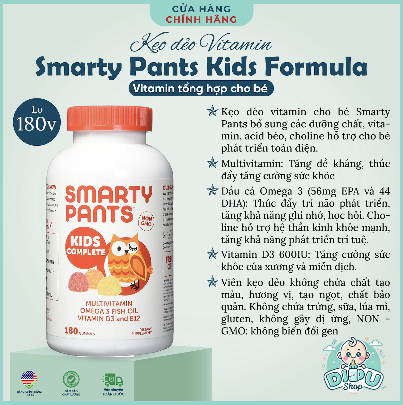 – Kẹo Vitamin SmartyPants với 13 dưỡng chất thiết yếu như B12, vitamin E, Folic Acid và đặc biệt là dầu cá bổ sung Omega 3 tốt cho sự phát triển trí não của bé.