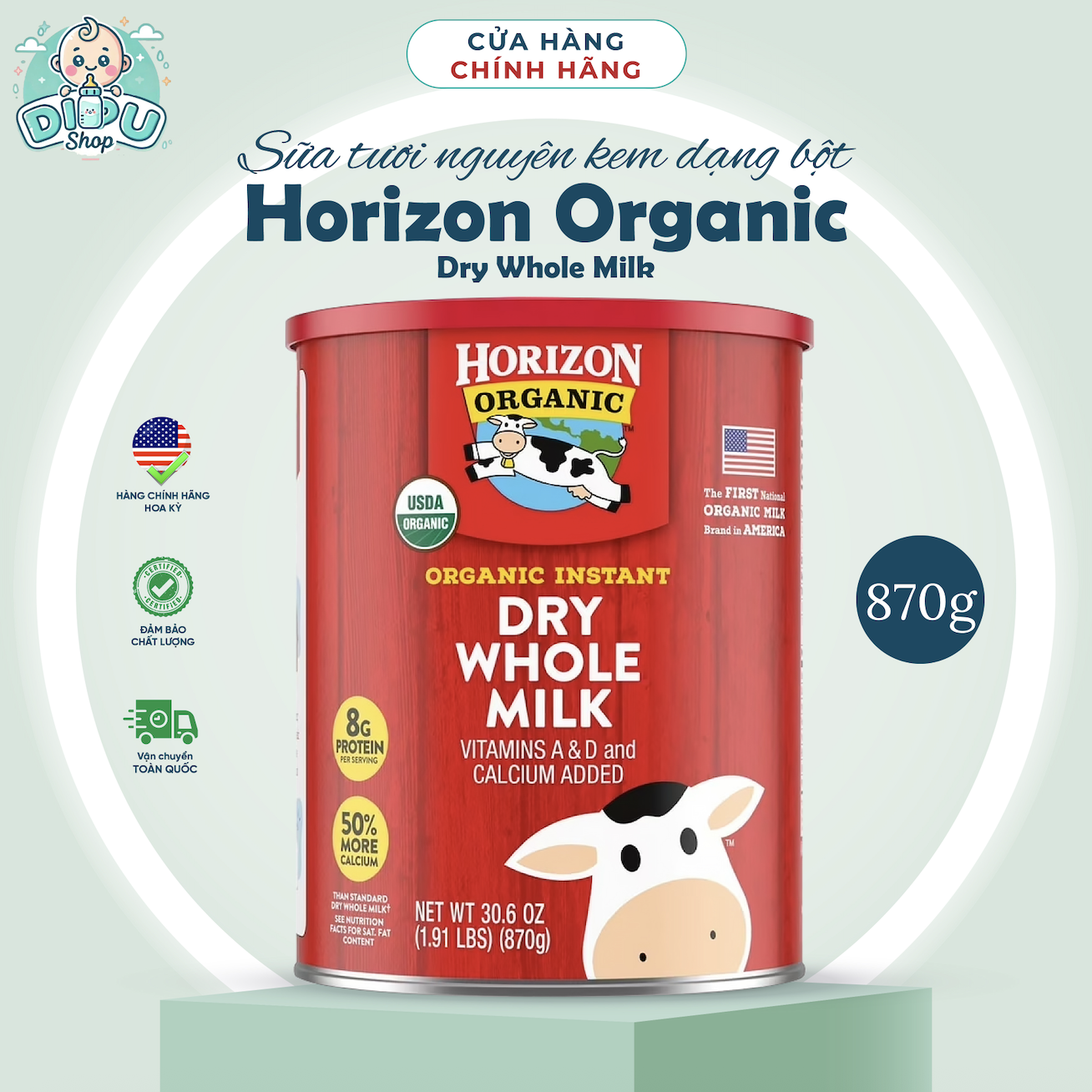 Sữa bột nguyên chất Horizon Organic Dry Whole Milk 870G Sữa nguyên chất được bổ sung Vitamin A và D và chứa nhiều canxi hơn 50% so với sữa nguyên chất dạng bột tiêu chuẩn khác