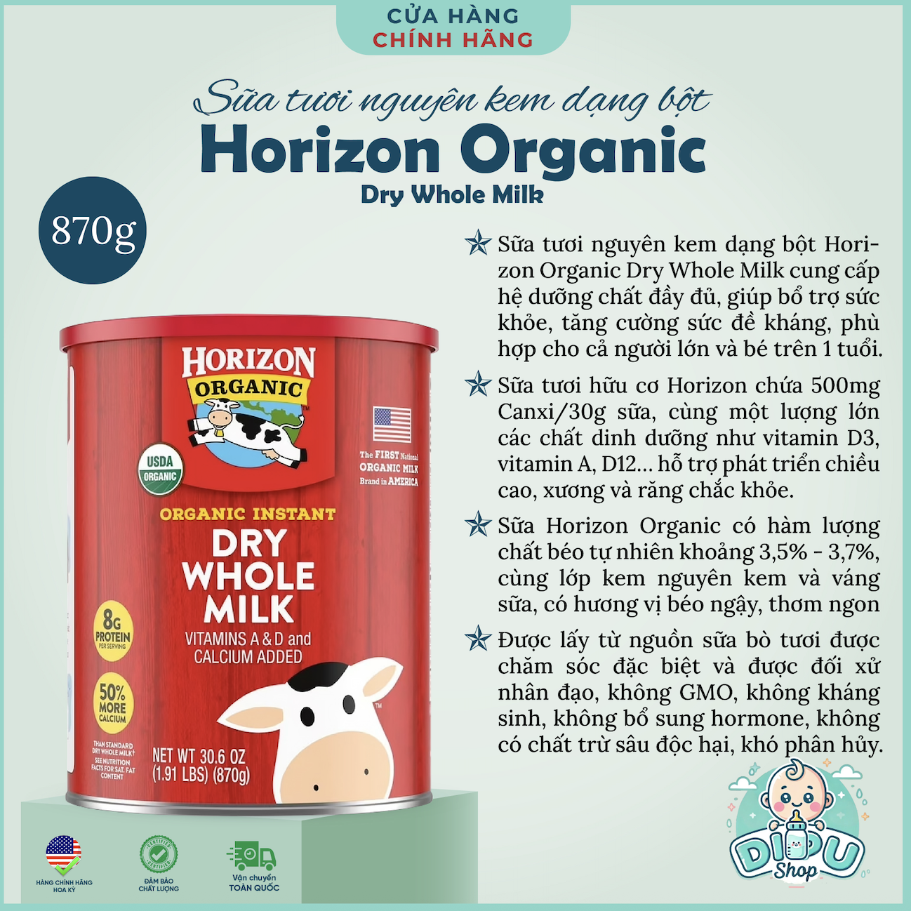 Dễ dàng tùy chỉnh các phần.Sữa bột nguyên kem Horizon Organic Dry được chứng nhận hữu cơ nên: không biến đổi gen, không kháng sinh, không bổ sung hormone. Không có thuốc trừ sâu độc hại hoặc dai dẳng và đối xử nhân đạo với bò.