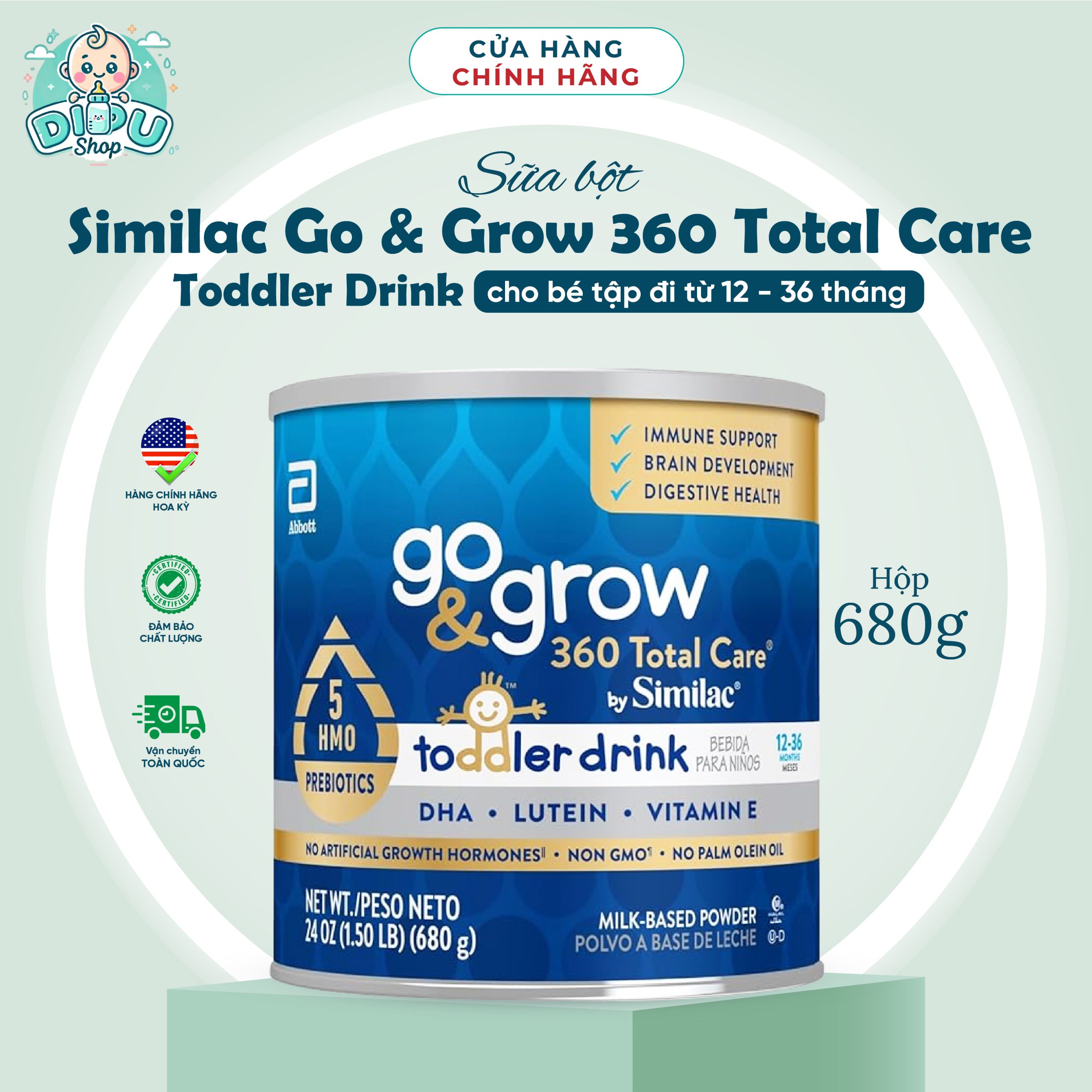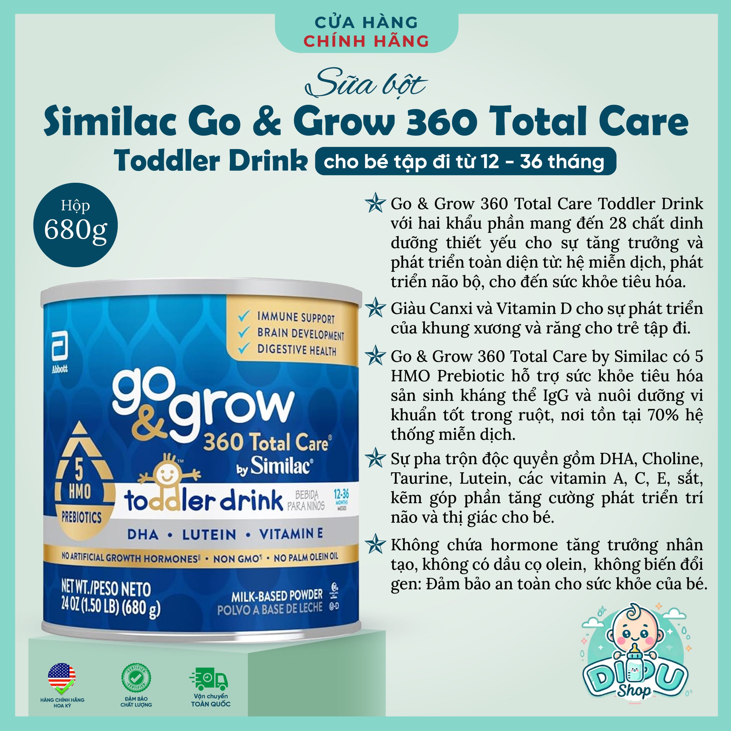 Go & Grow 360 Total Care của Similac* là thức uống dinh dưỡng đầu tiên dành cho trẻ mới biết đi có 5 HMO. Prebiotic HMO hỗ trợ sức khỏe tiêu hóa và nuôi dưỡng vi khuẩn tốt trong ruột, nơi tồn tại 70% hệ thống miễn dịch. Hai phần ăn† có 28 chất dinh dưỡng quan trọng cho sự tăng trưởng và phát triển. Go & Grow 360 Total Care có sự pha trộn độc quyền của DHA để phát triển trí não và mắt, lutein để hỗ trợ sức khỏe của mắt và vitamin E để hỗ trợ các tế bào đang phát triển. Nó không có hormone tăng trưởng nhân tạo‡ và không biến đổi gen.