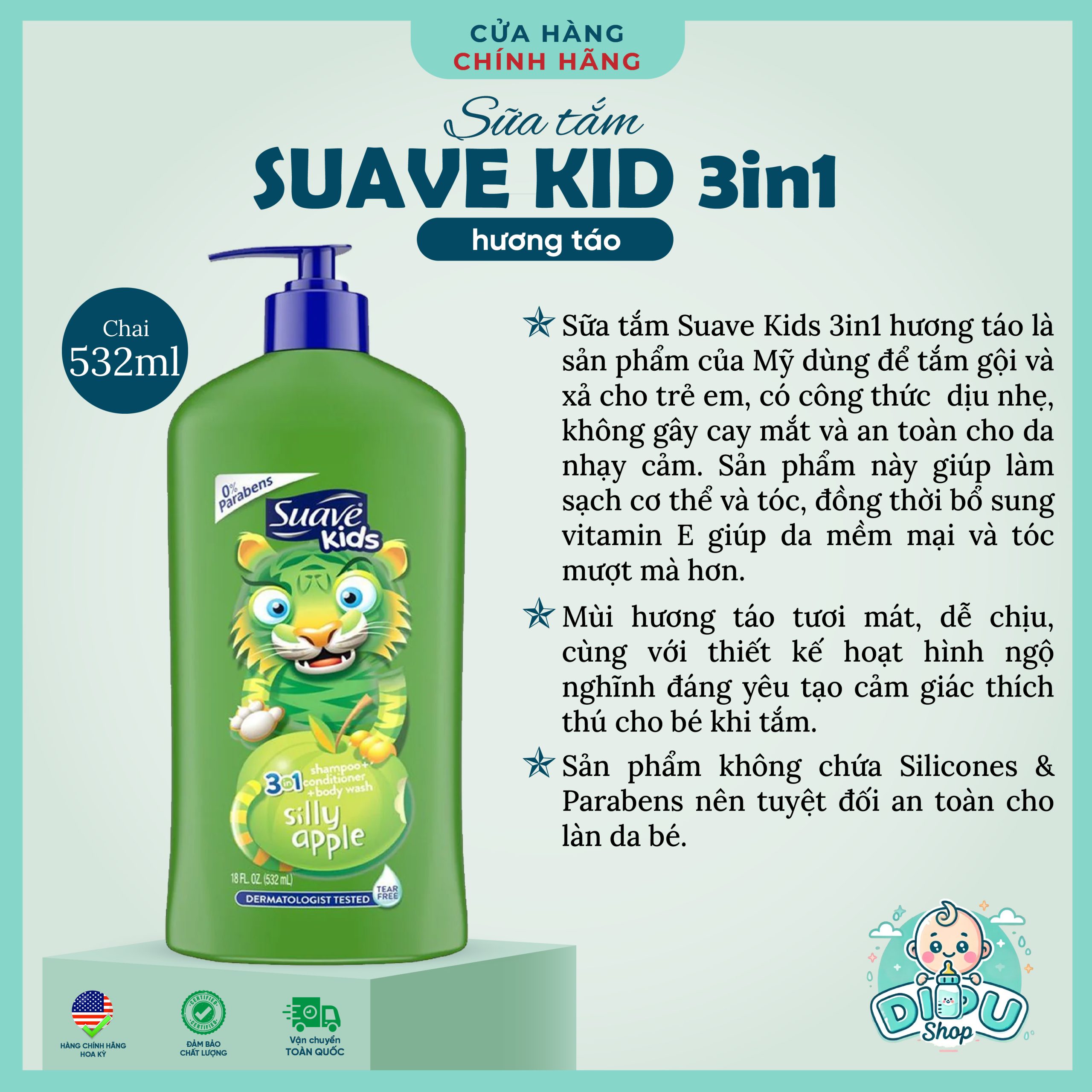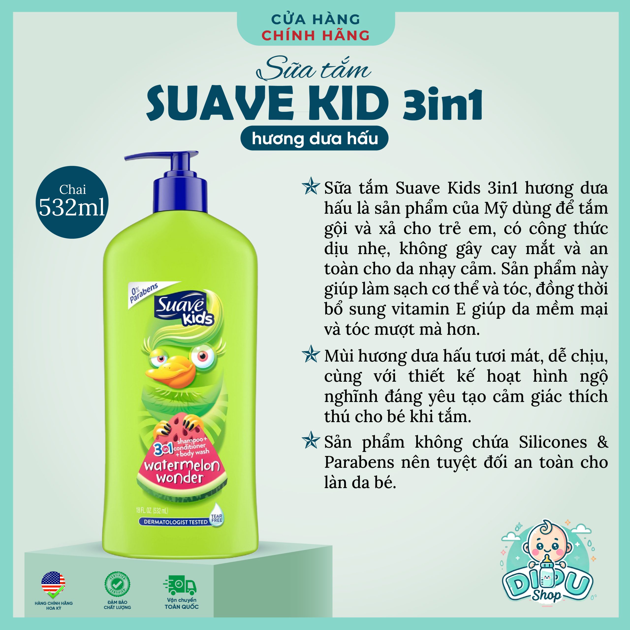🍉 Sữa tắm gội và xả trẻ em Suave Kids 3 in 1 là một sản phẩm của hãng Suave, một thương hiệu nổi tiếng hơn 70 năm qua tại Mỹ.
