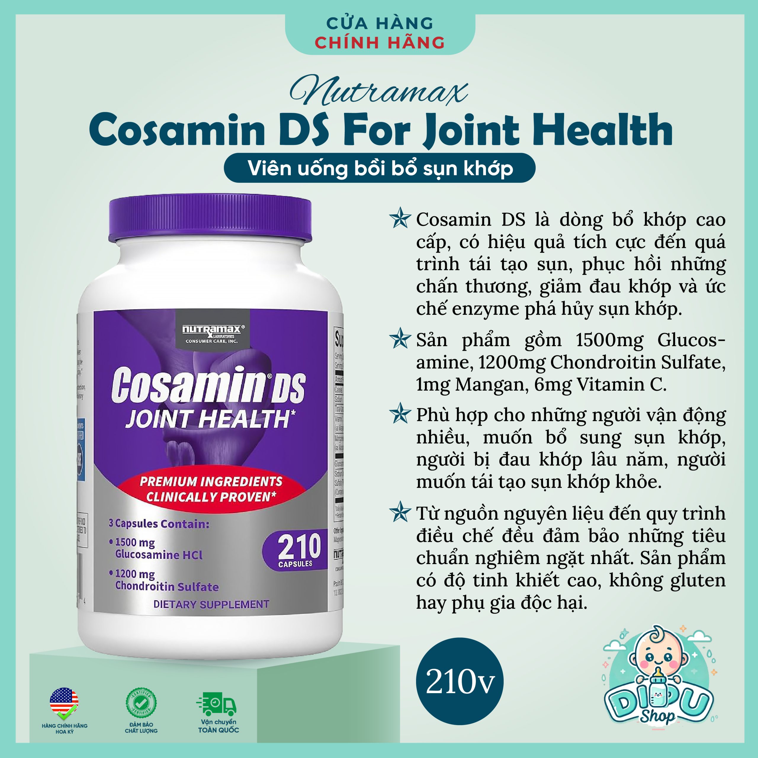 👉 Cosamin DS là dòng bổ khớp cao cấp đang được ưa chuộng tại Mỹ và nhiều quốc gia. Công thức dưỡng chất trong viên uống bồi bổ sụn khớp Cosamin đã được nghiên cứu rất kỹ lưỡng và chứng minh lâm sàng là có hiệu quả tích cực đến quá trình tái tạo sụn, giảm đau khớp và ức chế enzyme phá hủy sụn khớp.
